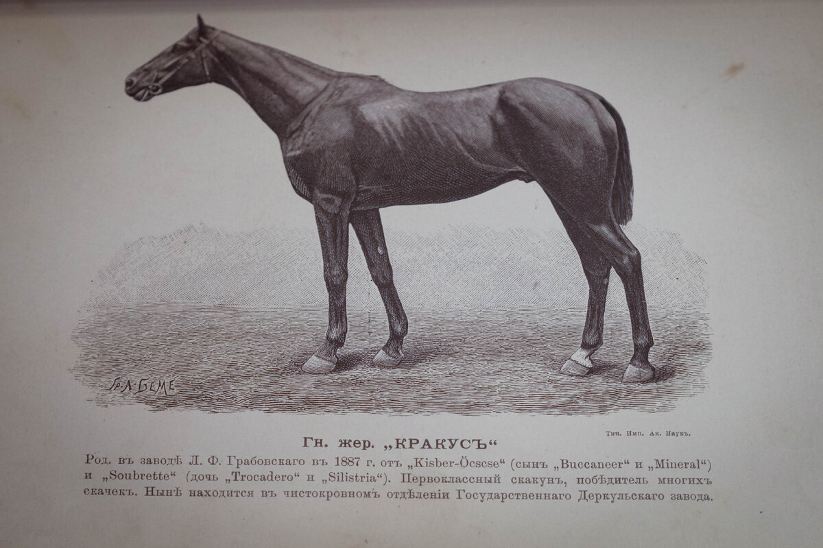 В работе у нас – удивительная “Книга о лошади. Настольная книга для каждого владельца и любителя лошади” графа К. Г. Врангеля под редакцией князя С. П. Урусова 1898 года. Первое издание двухтомника пришло с распадающимися блоками, отделенными страницами, потертостями, утратами и надрывами. Нам предстояло очистить, пересобрать и укрепить блоки, дорастить утраты и надрывы, а также отреставрировать корешки и уголки переплетов. Мы заменили форзацы, сделав новые из идентичной бумаги. На сторонках книг бумага тоже требовала замены – ее мы сделали самостоятельно вручную. Издание разрабатывалась настоящими профессионалами в вопросах иппологии – шведским графом К. Г. Врангелем и князем С. П. Урусовым – и стало лучшим трудом о лошадях за весь дореволюционный период. До этого в русской специализированной литературе не было полноценного всеобъемлющего руководства по содержанию лошадей, искусству верховой езды, рациону, уходу, физиологии и здоровье лошадей. Руководство во многом основывается на кни