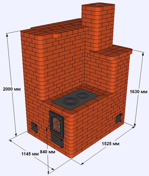 Дровяная отопительно-варочная печь «Уголок» из кирпича, с угловым обогревательным щитком, варочной плитой и водяным контуром, предназначена для отопления индивидуальных жилых помещений дома или дачи, общей площадью до 80 квадратных метров, а также приготовления пищи. Печь также может работать с водяным контуром, если встроить теплообменник в предназначенный для этого дымовой канал. В этом случае объем отапливаемых помещений значительно возрастает. В печи предусмотрен также прямой («летний») дымоход. Для кладки печи требуется 1050 шт. красного печного кирпича. В печи имеется прямой (летний) дымоход. Это удобно при растапливании холодной (настывшей) печи и исключает дымление внутрь помещения. Дополнительные дымовые задвижки позволяют при работе печи отключать от нагрева как нижнюю, так и верхнюю части отопительного щита, или весь щит целиком. То есть, при приготовлении пищи на варочной плите в теплое время года, можно не нагревать щит и не допускать большого нагрева воздуха в помещениях