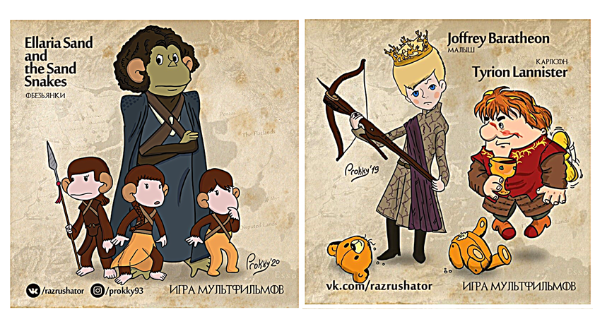Прокопий Уляшов с детства любил советские мультфильмы. Прежде он работал в юношеской библиотеке, а рисование было лишь хобби. Вдохновляясь любимыми персонажами из мультиков и Прокопий создавал забавные и красочные арты под ником Prokky. Иллюстратор отправлял их в иные кино-вселенные, а необычные работы размещал в соцсетях, например в vk.com. Его талант, свежий взгляд и идеи приметили, пригласили работать в студию "Союзмультфильма". Вот так хобби постепенно стало любимой работой. На студии он работает с 2019 г, в отделе маркетинга, занимается продвижением мф в соцсетях. А в свободное время творит безумно интересные кроссоверы. В этот раз вас ждут работы, которые принесли известность художнику из Сыктывкара. Он смешал персонажей советских мультфильмов с популярным телесериалом «Игра престолов». Всего насчитала 35 артов по теме. Сегодня вас ждёт третья часть материала. (ссылки на 1-ю и 2-ю будут в конце статьи). Поверьте, это стоит посмотреть. Мф «Шайбу! Шайбу!» Хоккеисты из мф стали Кор