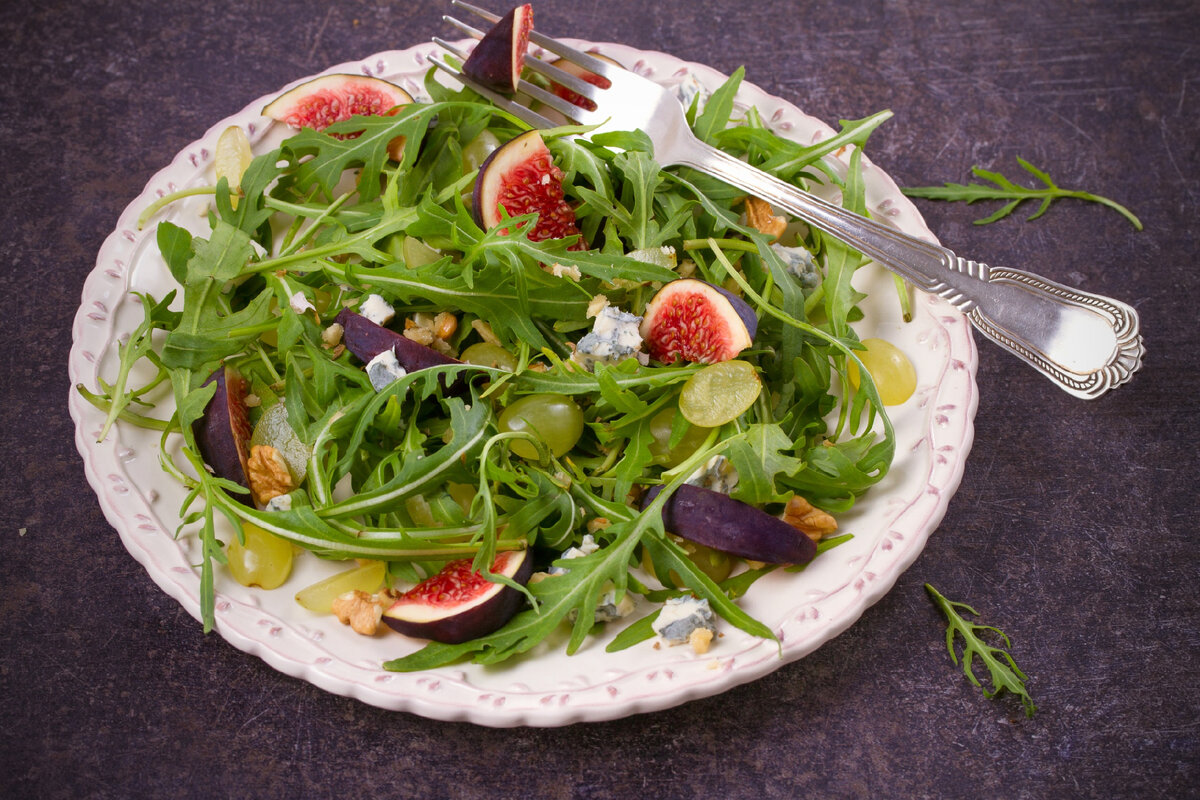 Фиги, сыр и грецкие орехи с рукколой и медовым дрессингом