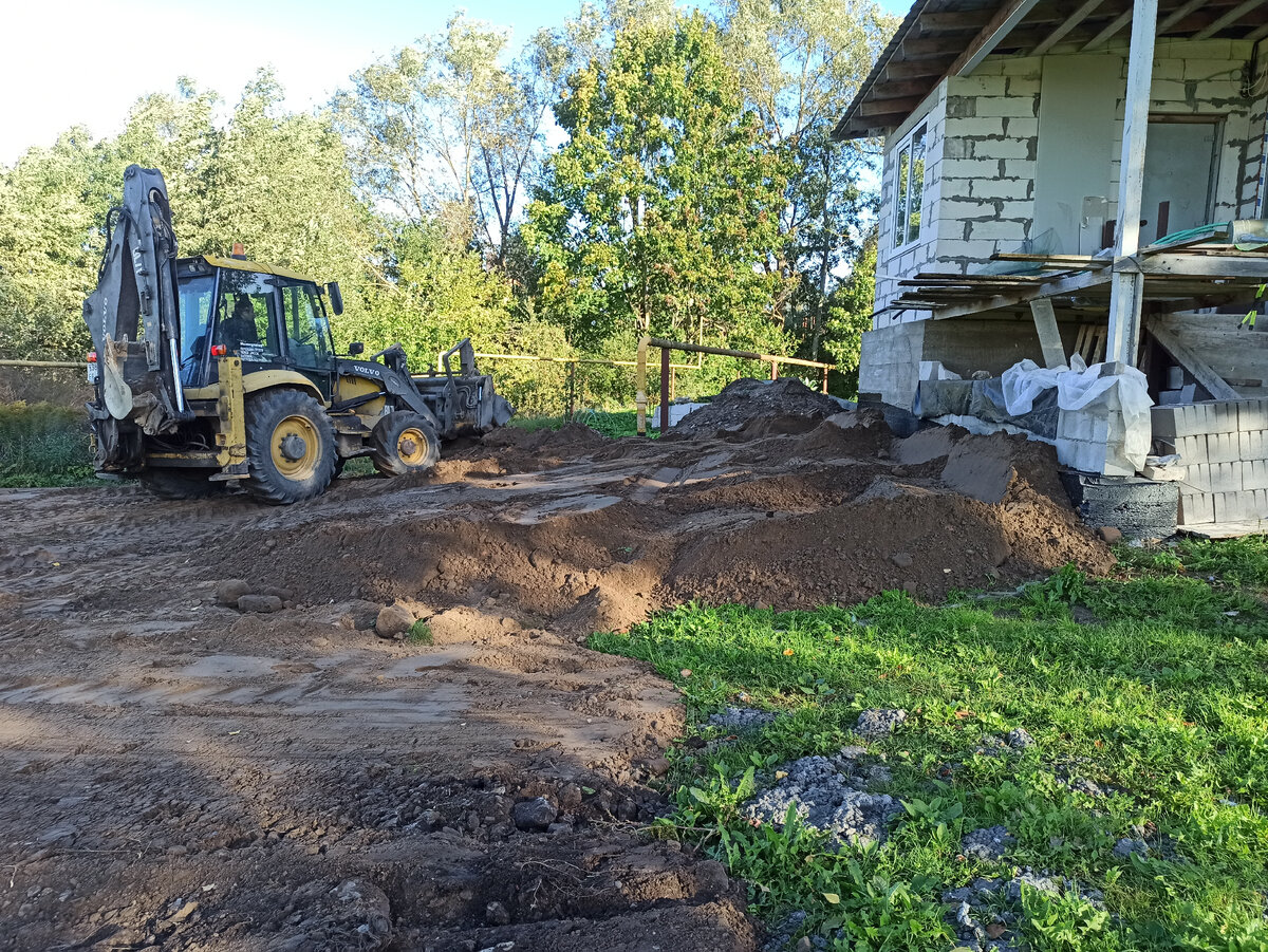 Вот и пришел долгожданный день отсыпки периметра дома. Мы торопились сделать это до холодов, чтобы успеть положить мембрану под отмостку. Саму отмостку отложили до следующего года. Грунт в некоторых местах боднят почти на метр и нужно, чтобы он уплотнился. Скорее всего, придется ещё немного подсыпать до желаемого уровня. О причинах важности отсыпки я расскажу чуть позднее. У нас есть очень веская причина уйти в эту зиму с обкопаным фундаментом и гидроизоляцией отмостки. *** Экскаватор приехал с раннего утра и сразу приступил к работам. В первую очередь разобрал грунт, который лежал перед домом. Попутно пришла идея перенести подпорную стенку вдоль подъезда к дому. Будем обдумывать , возможно, совместим с первоначальным вариантом. Грунт нам привозили с дорожных ремонтов в городе, поэтому было много лишнего мусора: большие куски асфальта, нашлись даже 2 целых поребрика и неожиданно полутораметровое бетонное дно колодца. Как новое. Все такие ништяки мы попросили выбрать из отсыпки и