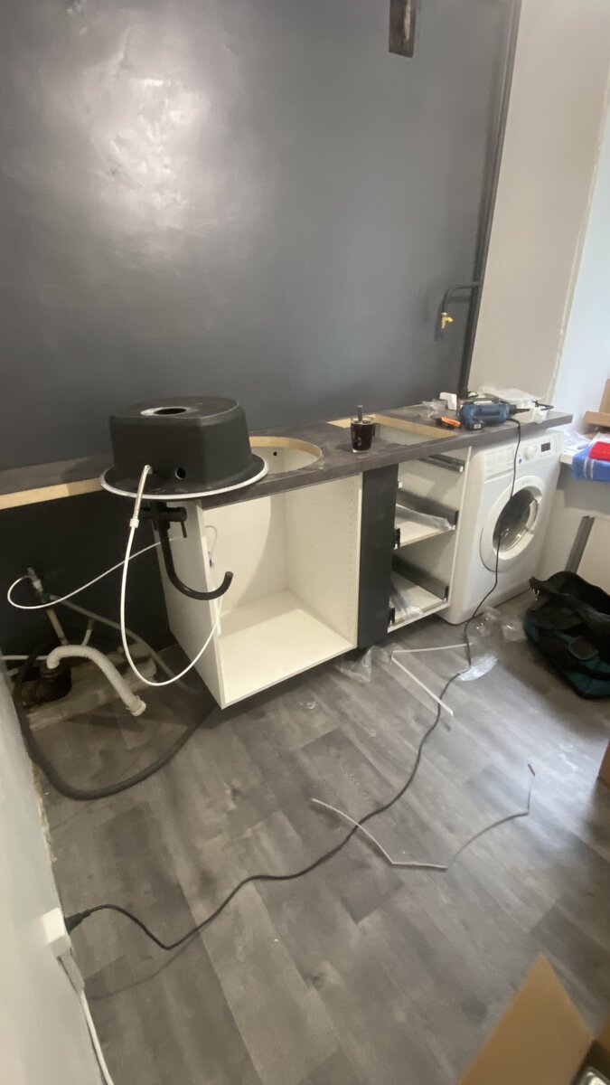 Кухня готова к использованию и осталось просто съездить в такой уже родной Леруа и заказать саму кухню. Мы приехали в Леруа, там есть отдел проектировки кухонь. Дальше как в МФЦ: выбираешь дату, время и приходишь к специалисту. Мы рассказали все подробности, каждый выступ, сколько сантиметров у нас каждая стена, все изъяны, где что у нас будет стоять и что из мебели нам нужно. Нам всё подобрали, нарисовали на компьютере нашу кухню и выставили счёт. После оплаты нас записали на доставку (не более трёх недель с момента оплаты) и нам оставалось просто ждать. Саму кухню привезли быстро, дня через 2-3 она уже лежала у нас в разобранном виде в маленькой комнате. А вот сборку должна была сделать другая фирма. Из-за пика сезона ремонтов мы ждали мастера больше месяца. И, наконец, к нам приехал рабочий. Буквально за 4 часа он нам собрал всё, подключил воду к раковине, установил фильтр, вырезал разъём для холодильника и варочной панели и даже подключил газ к ней. Кстати, когда мы только на