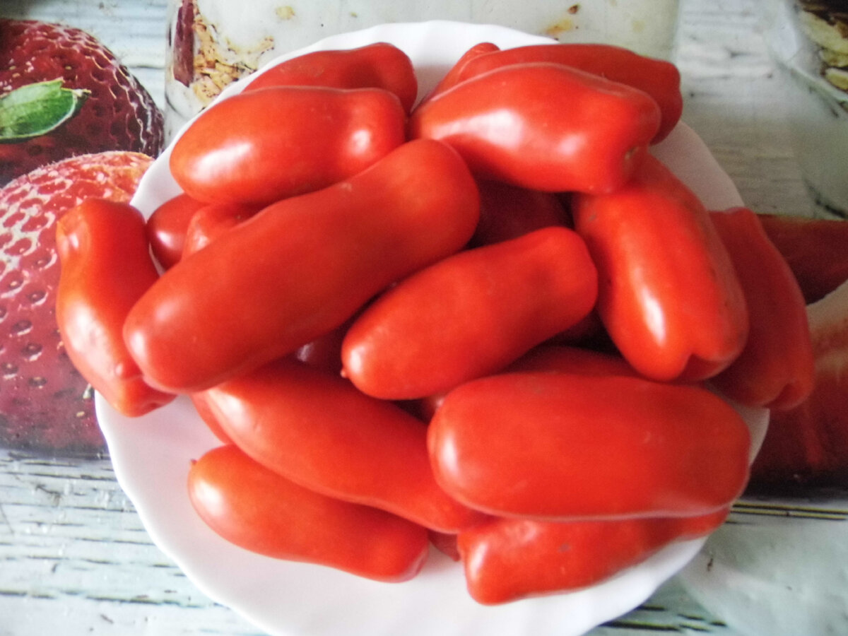 Дорогие друзья и гости моего канала! Рада всем, кто заглянул на мой канал! В этом году я сажала очень много новых сортов томатов. В том числе и томат агрофирмы Биотехника, г. Санкт-Петербург, "Жиголо". Среднеспелый, низкорослый сорт. Форма плода сильно-вытянуто-цилиндрическая-длина плода 15-16 см, диаметр 3-4 см. Плоды красного цвета, массой 130-140 г. Универсального применения. Сеяла на рассаду семена я 24 марта. Из пяти посаженных семян, взошло три. Три корня томата "Жиголо" я и высадила в грунт. Томат мне очень понравился. Сорт очень урожайный. Вот мои помидорки. Помидоры в разрезе. Помидорки на весах. А это фото томатов с помидорами на грядке. Помидоры томата "Жиголо" очень хороши для заморозки. Пробовала завялить, но очень примитивным способом. Выбрала помидоры поменьше. Порезала потоньше. А вот как они подвялились. Ещё поставила вялить. А вы сажали томат "Жиголо"? Какое впечатление у вас осталось от этого томата? Ну вот и всё на сегодня! Спасибо всем, кто дочитал до конц