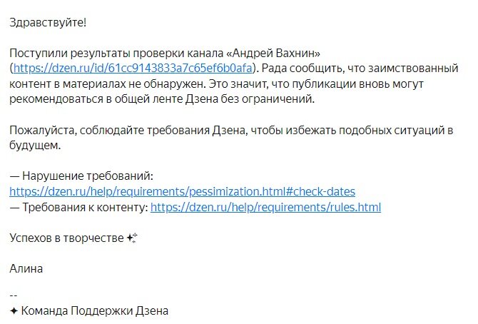 Под репрессии канал попал вчера, 19 сентября. Реабилитирован сегодня к вечеру 20 сентября. Два дня без начислений, хотя публикации показывались очень активно, хоть и по подписчикам только. Вот оно, радостное и волнующее письмо Для проверки за день загрузил 10 новых публикаций. Было бы странно найти в них нарушения Но ТП и до этого нарушений не видели Получив письмо, зашел на канал, полюбоваться Чисто. Больше пока ничего загружать не буду. Итак 10 публикаций внеплановых. Посмотрю как канал отработает после возврата из ограничения.