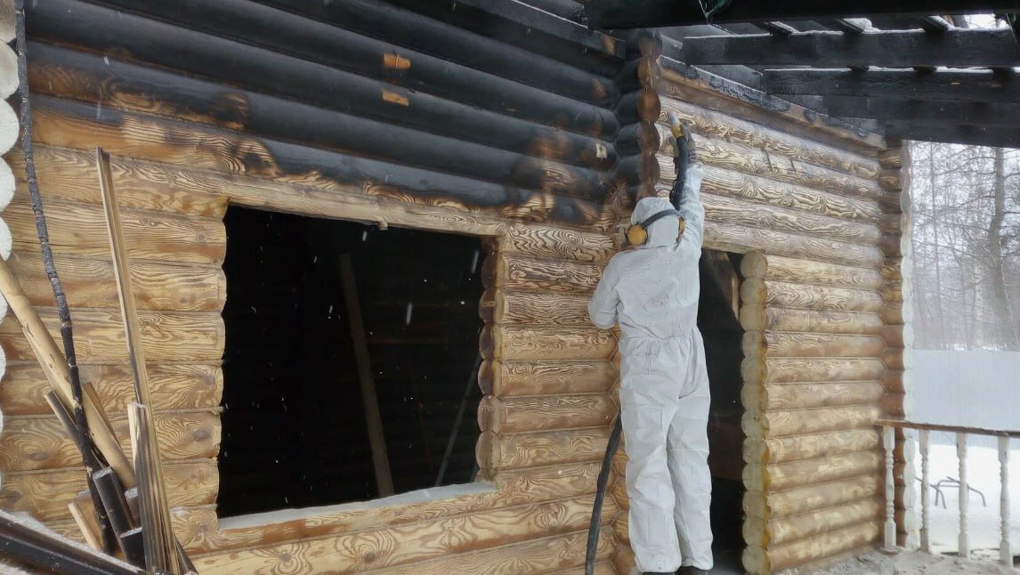 Далее приступаем к очистке. Главная задача здесь: снять весь обгоревший слой. На данном этапе разумнее всего воспользоваться УШМ с металлической щеткой. С ее помощью удаляются крупные обгоревшие куски, но не стоит увлекаться и "драть" стену до здорового дерева. Такая обработка откроет все проблемные места, в каждом из которых, возможно, придется принимать дополнительные меры по восстановлению. Работать необходимо полностью в защитной одежде. Лучше купить недорогой строительный комбинезон с капюшоном, а также запастись противогазом или очками с респиратором. По мере зачистки всю пыль убираем при помощи строительного пылесоса, чтобы она не оседала на уже зачищенных стенах.