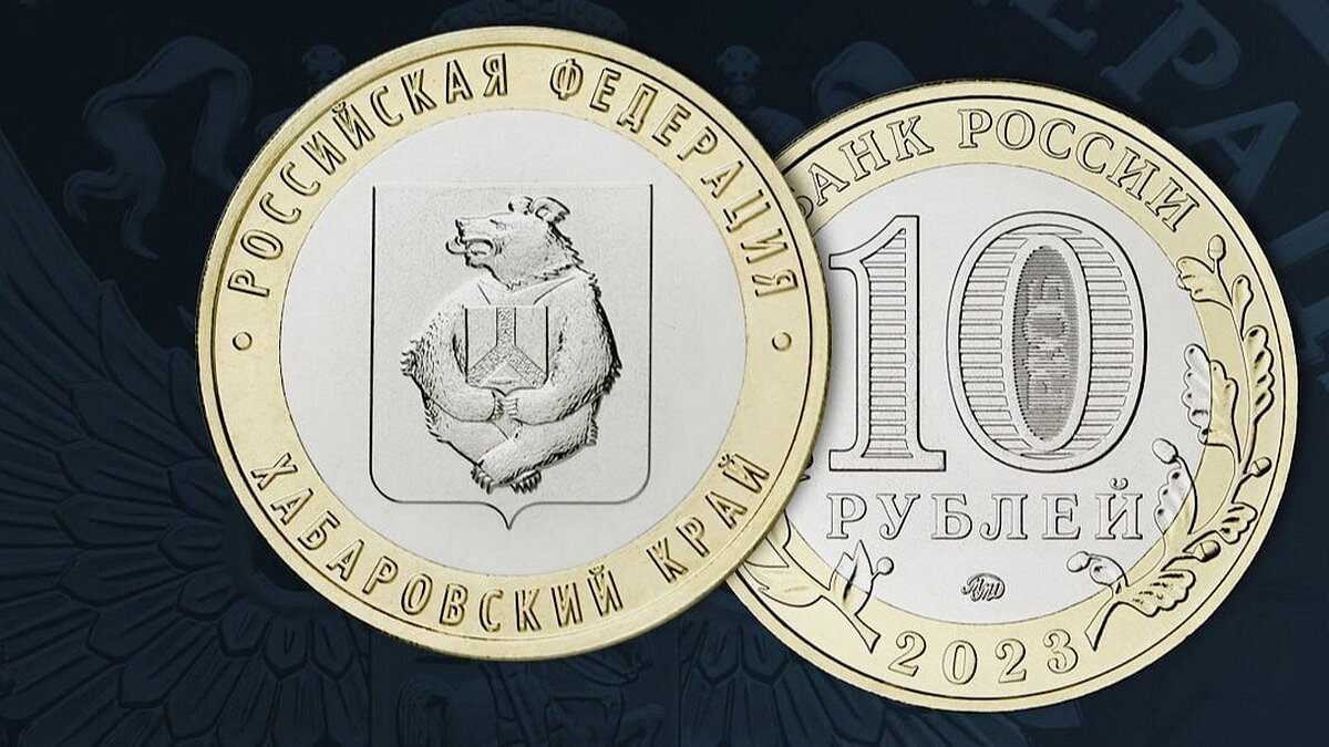 На лицевой стороне указан номинал и расположены надписи «Банк России» и «2023». На внешнем кольце изображены ветви дуба и лавра. На оборотной стороне — герб Хабаровского края с медведем.