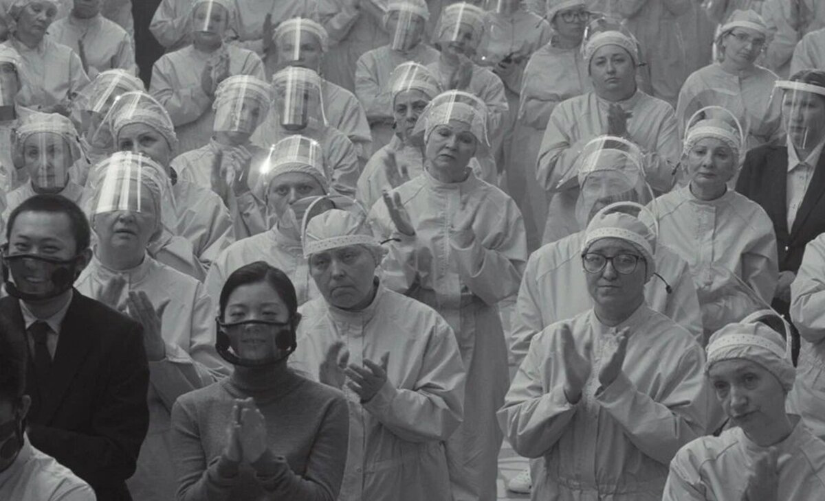 С заторможенной пластикой, с измененным, чуть смещенным центром тяжести в каждой сцене. Ключевая материя фильма — постоянная, постепенно сгущающаяся тревога. Она здесь во всем. В дизайне маски в этой альтернативной версии пандемии: прозрачной, футуристической, как бы стремящейся скрыться из виду, слиться с лицом — и приковывающей к себе взгляд. Точнее — к той немоте, которую она символизирует. Отсутствию кислорода. Удушью.