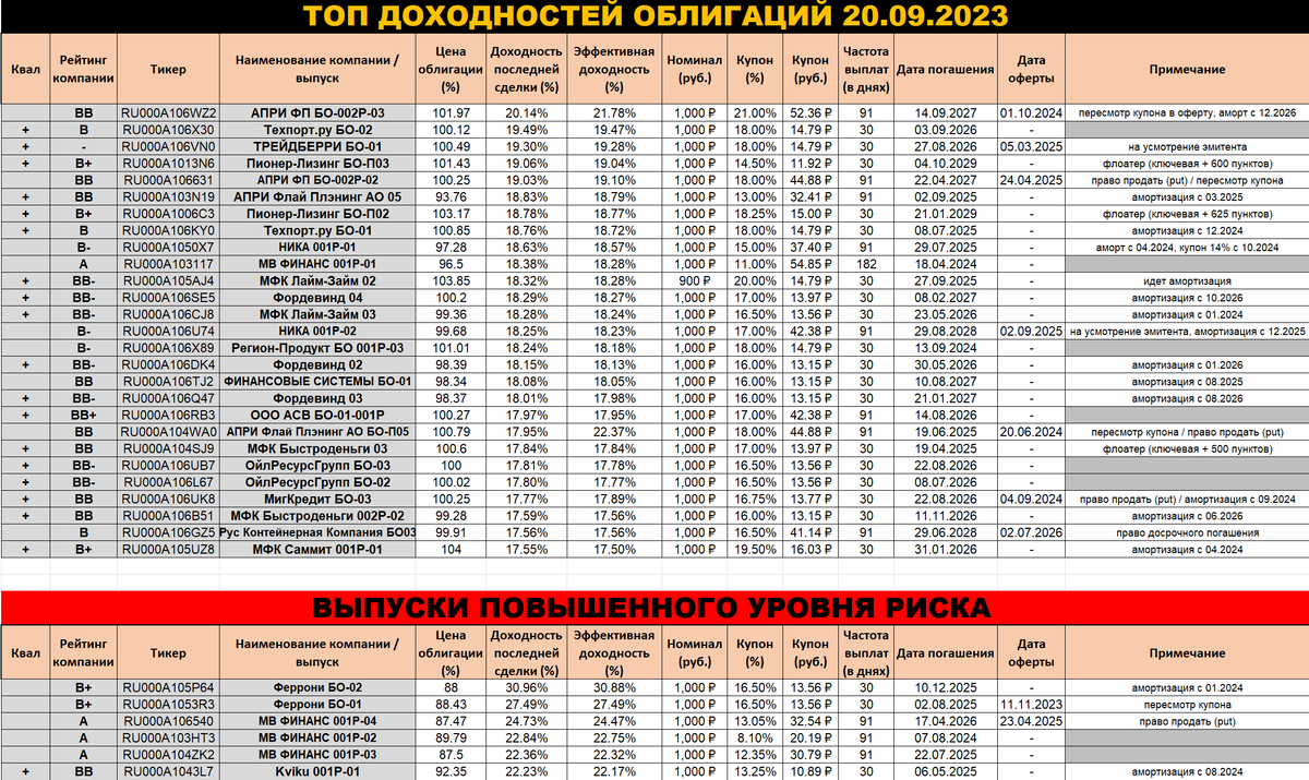 🗞 Привет, дорогие подписчики! Среда выдалась достаточно насыщенной - пора навести порядок в новостном завале. Усаживайтесь поудобнее, отправляемся! ---------- 🆕 НОВЫЕ РАЗМЕЩЕНИЯ / АНОНСЫ: 🔸 АЛЬФА ДОН ТРАНС - дебютант долгового рынка. Тем интереснее будет новое размещение, которое состоится на бирже 26 сентября. Товарищи вполне в тренде текущих финансовых условий - квартальный купон в 18%, 4 года размещения с небольшой амортизацией в процессе и 300 миллионов рублей в сумме. Счастье? Да вполне, такую доходность надо сохранить в портфеле для истории. Рейтинг от Эксперта 🅱️➕ со стабильным прогнозом, а за первичку отвечает... пока непонятно кто :( 🔸 ПЛАЗА ТЕЛЕКОМ - второй дебютант дня, очень радостное событие. Чуть уступают предыдущему коллеге по купону, однако: 200 миллионов рублей, квартальный купон в 17,15 % (по секретным источникам, привет им😉) и возможность досрочного погашения в дату 4 и 8 купонов. Вполне достойно, согласитесь. Рейтинг 🅱️🅱️➖ от НКР, организатор первички пок