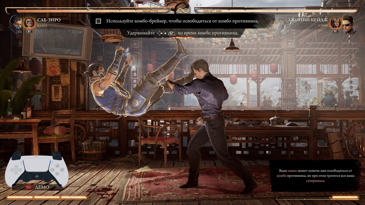 Цена за спасение высока. В Mortal Kombat 1 геймеры постоянно ловят соперника на ошибке и начинают длинные комбо. Некоторые мастера так хороши, что сносят половину здоровья одной серией ударов. Что делать, если против вас начали комбо? Все о Mortal Kombat 1 в одном месте: от гайдов и секретов до полного прохождения Обратите внимание на шкалу усиления в углу экрана, которая заполняется во время атак. Не расходуйте шкалу на одиночные снаряды с повышенным уроном. Тратьте усиление, чтобы продлить свое комбо и остановить чужое. Противник начал серию ударов? За мгновение до очередной атаки одновременно нажмите кнопку движения вперед (→) и блок (R2 на PlayStation, RT на Xbox, ZR на Switch и O на ПК). Камео-боец сразу выбежит на арену и отбросит врага. Важно: для приема нужна заполненная шкала усиления. После использования она обнулится. 8 хитростей из Mortal Kombat 1, которые нужно знать перед игрой Чтобы отработать прерывание комбо, перейдите в режим «Инструктаж». Там выберите разделы «Основы