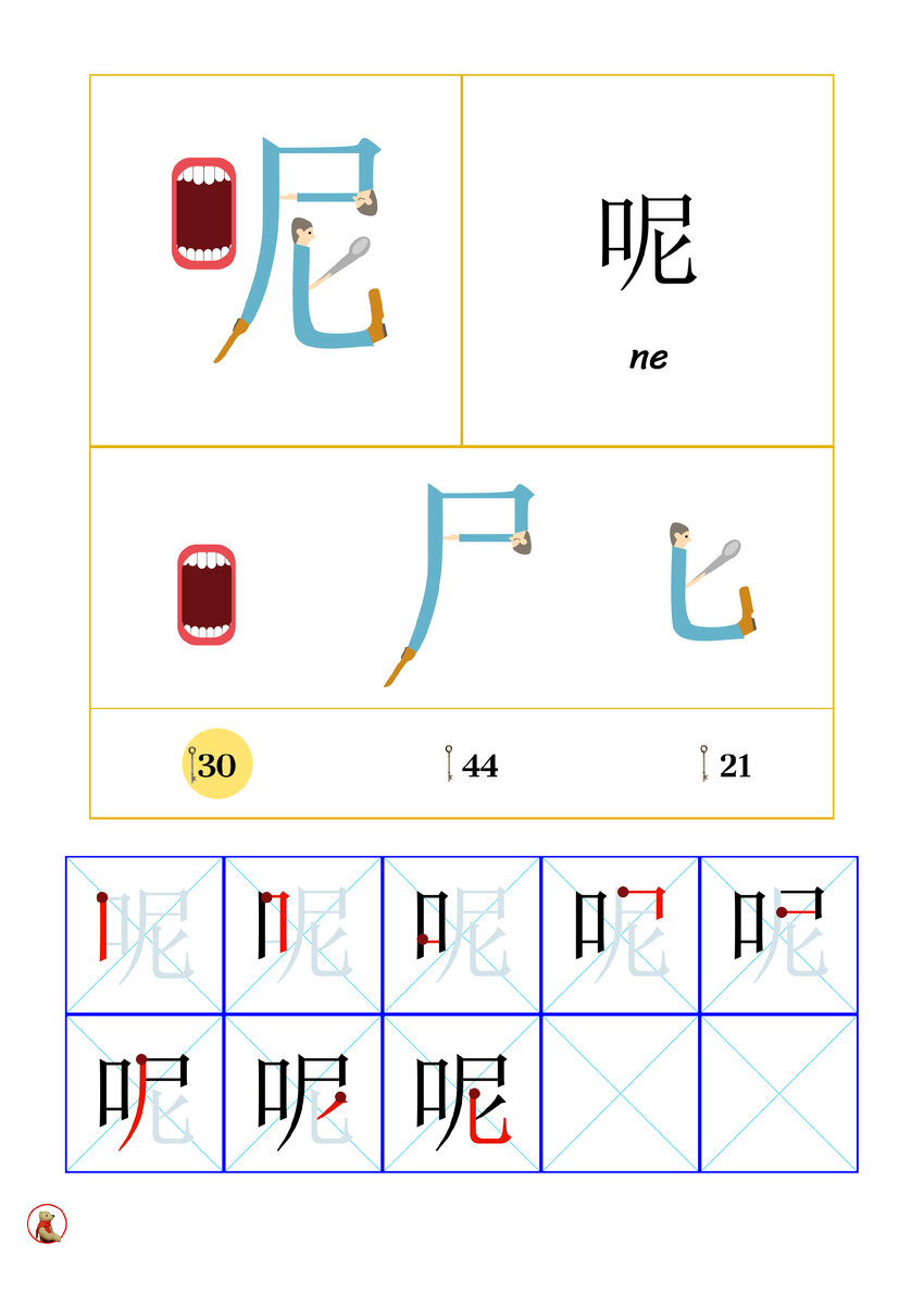 Иероглиф 呢 ne - сложный иероглиф с горизонтальной структурой. Произносится пятым нейтральным тоном.