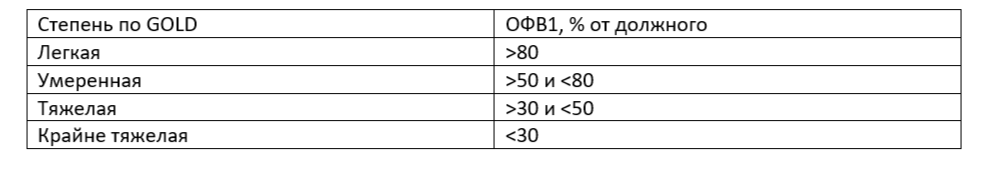 Ранее классификация ХОБЛ строилась на показателях функционального состояния легких, базирующихся на постбронходилатационных значениях объема форсированного выдоха за 1-ю секунду (ОФВ1), и в ней выделялось 4 стадии заболевания. По степени тяжести нарушения бронхиальной проходимости (обструкции):