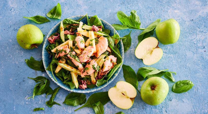 1.Яблоки очистите, нарежьте крупной соломкой, полейте лимонным соком, чтобы они не темнели.Такими же брусочками нарежьте огурцы, сбрызните лимонным соком, поперчите.