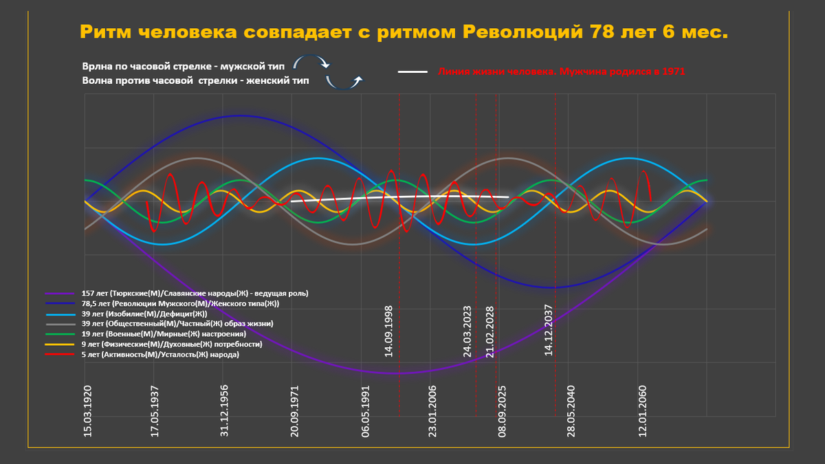 Человек — это полный цикл Вечного Движения с ритмом 28672 дня (78,6 лет). Нулевой порядок – человек. Первый порядок равенство противоположностей мужская и женская сторона. К мужской стороне в математике Пушкина относится физическая сторона (хозяйственная). К женской стороне относится – духовная(семейная). Первая половина жизни у мужчин (до 39,3 лет) – мужского рода, вторая половина с 39,3 до 78,6 - женского. Этот переход несёт существенные изменения в жизнь человека. У женщин первая половина жизни – женского рода вторая мужского. Из моделей Пушкина фазы развития мужчины: зеленая, красная, синяя, малиновая. У женщин наоборот: малиновая, синяя, красная, зеленая. Мужчина Первая фаза до 19,6 лет – зелёная фаза означает рост. Мужчина набирается знаний опыта. Мальчики рождаются беспомощными, не знающими своего места в жизни. Любопытство и опыт через ошибки учит их. С 19,6 до 39.3 лет – красная фаза, фаза борьбы. Самая сложная фаза. Выход в общество, поиск своего места, самоутверждение. Чем