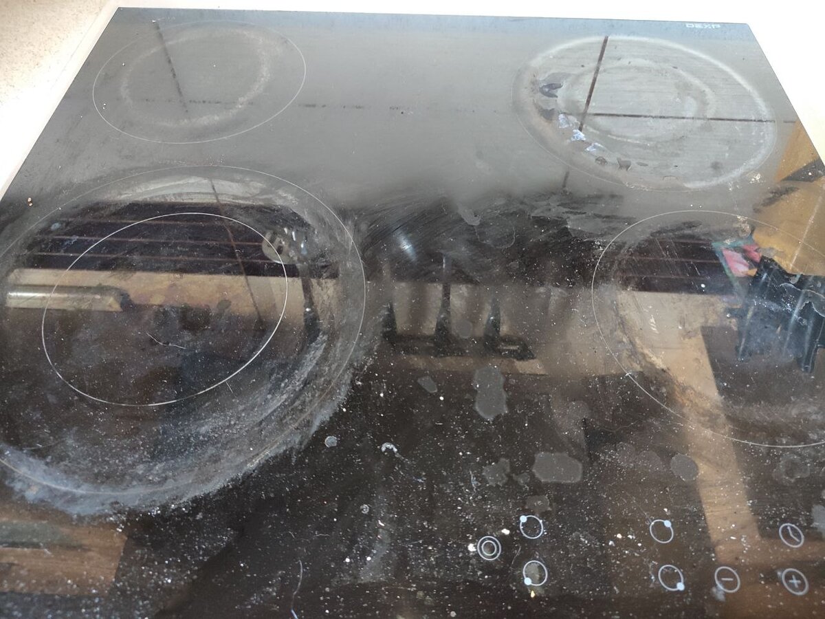 Вымыть плиту за пять минут не так просто, если это стеклокерамика. А вот так бывает, когда оставляешь мужчин одних. Хватило несколько дней, чтобы довести ее до такого состояния. Ну ничего, у меня есть отличное средство, которое одинаково быстро отмывает застарелые пятна или поддерживает чистоту при использовании каждый день. Царапать стеклокерамику металлическими губками я не хочу - снимается красивый зеркальный слой, потом жир ещё больше начинает прилипать. В магазинах много средств с жирорастворяющим эффектом, но для своей стеклокерамики ничего не нашла.