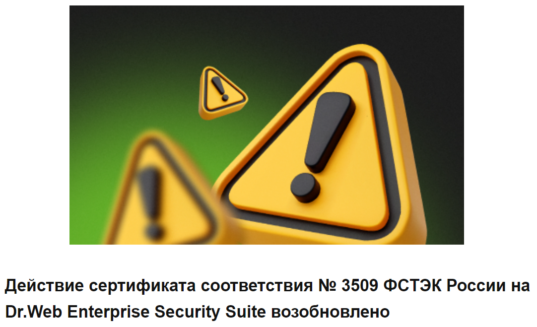 Действие сертификата соответствия ФСТЭК для Dr.Web возобновлено