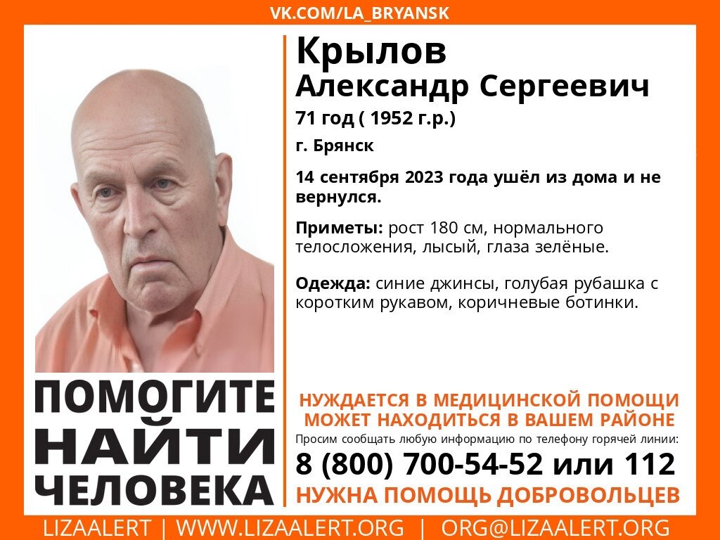 В Брянске продолжаются безуспешные поиски местного жителя Александра Сергеевича Крылова. Мужчине 71 год, он нуждается в медицинской помощи. Пенсионер пропал 14 сентября 2023 года, когда ушёл из дома и не вернулся. Приметы пропавшего сообщили в поисковом отряде «Лиза Алерт», волонтеры которого распространили в соцсетях ориентировку на пропавшего. Его рост 180 сантиметров, нормального телосложения, лысый, глаза зеленые. Был одет в синие джинсы, голубую рубашку с коротким рукавом, коричневые ботинки. Всех, кто располагает сведениями о пропавшем, просят позвонить по телефонам 8 800 700 54 52 (Горячая линия ЛА) или 02, 102 (полиция). Поиски 71-летнего брянца Александра Крылова пока не увенчались успехом