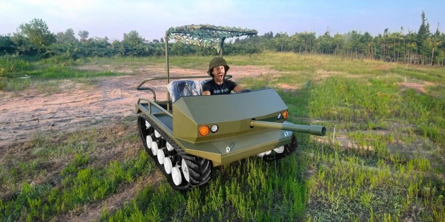 Торговая площадка Alibaba иногда удивляет необычными предложениями. Как, например, этот электрический танк для взрослых и детей. Его габаритная длина – 2,15 м. Салон рассчитан на двух человек. Пушка – кусок окрашенной ПВХ-трубы. Гусеницы тоже выглядят не слишком убедительно. В движение танк приводится двумя электродвигателями, суммарно генерирующими 8 л.с. Как отмечается, этой мощности достаточно для транспортировки двух взрослых «танкистов». Максимальная скорость обещана на уровне 30 км/ч. Для преодоления сложных участков, например подъемов на возвышенность, предусмотрена пониженная передача, которая урезает скорость до 5 км/ч. По словам продавца, танк способен преодолевать склоны до 40 градусов. Емкость аккумуляторного блока – 14,4 кВт•ч, что сравнимо с флагманским электрическим мотоциклом. И это не какой-нибудь дешевый свинцово-кислотный аккумулятор, а литий-ионный. В салоне танка установлен обычный руль и педаль газа, что не характерно для гусеничного транспортного средства. Более