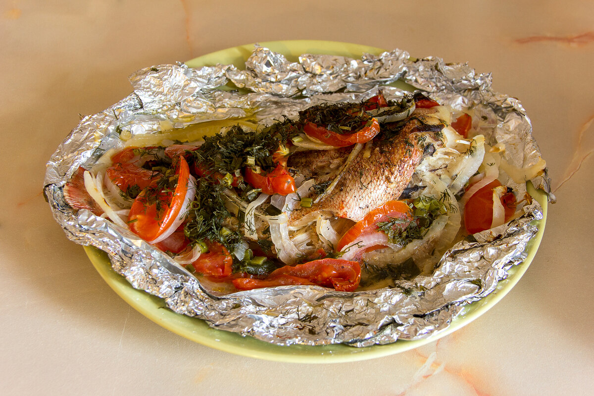 ИНГРЕДИЕНТЫ: ПРИГОТОВЛЕНИЕ: ШАГ 1. Рыбу почистить, отрезать голову и хвостик. ШАГ 2. Затем протереть рыбу в соли и специях, хорошенько обвалять. ШАГ 3. Почистить овощи, морковь нарезать кружочками, лук - небольшими кубиками и обжарить на сковороде 5 минут, затем залить водой и тушить еще 5-7 минут. Помидоры нарезать кружочками. ШАГ 4. В фольгу выкладываем примерно 1/4 овощей, поверх кладем рыбу и выкладываем еще 1/3 оставшихся овощей, запечатываем фольгу. Со второй тушкой тоже самое. ШАГ 5. Ставим в разогретую до 200-220 градусов духовку на 10-15 минут. ШАГ 6. Вытаскиваем, распечатываем фольгу, поливаем лимонным соком и отправляем снова в духовку на 10-15 минут. Приятного аппетита!