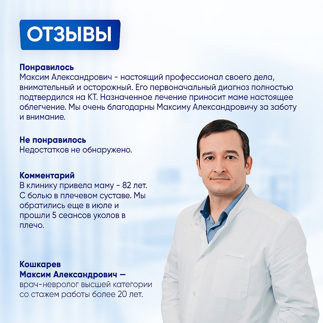 «Назначенное лечение приносит маме настоящее облегчение» Друзья, спасибо огромное за ваши отзывы! Особенно ценно, когда вы доверяете нам не только свое здоровье, но и здоровье самых близких людей. Посмотрите, что пишут наши пациенты — каждому помог один из врачей нашего медцентра. Кошкарев Максим Александрович — врач-невролог высшей категории со стажем работы более 20 лет. Масловская Зоя Владимировна — массажист, врач-физиотерапевт со стажем работы более 12 лет. Казаков Игорь Леонидович — врач-невролог, кинезиолог со стажем работы более 28 лет. Цой Лаврентий Валентинович — врач-невролог и реабилитолог высшей категории, рефлексотерапевт со стажем работы более 35 лет. В клинике «Ноосфера» мы используем различные подходы для лечения грыж и других проблем позвоночника и суставов — безоперационное лечение межпозвонковых грыж и протрузий на аппарате DRX, лечебный массаж, остеопатию, кинезиотерапию. После осмотра и консультации врач-невролог подберет наиболее эффективный вариант лечения именн