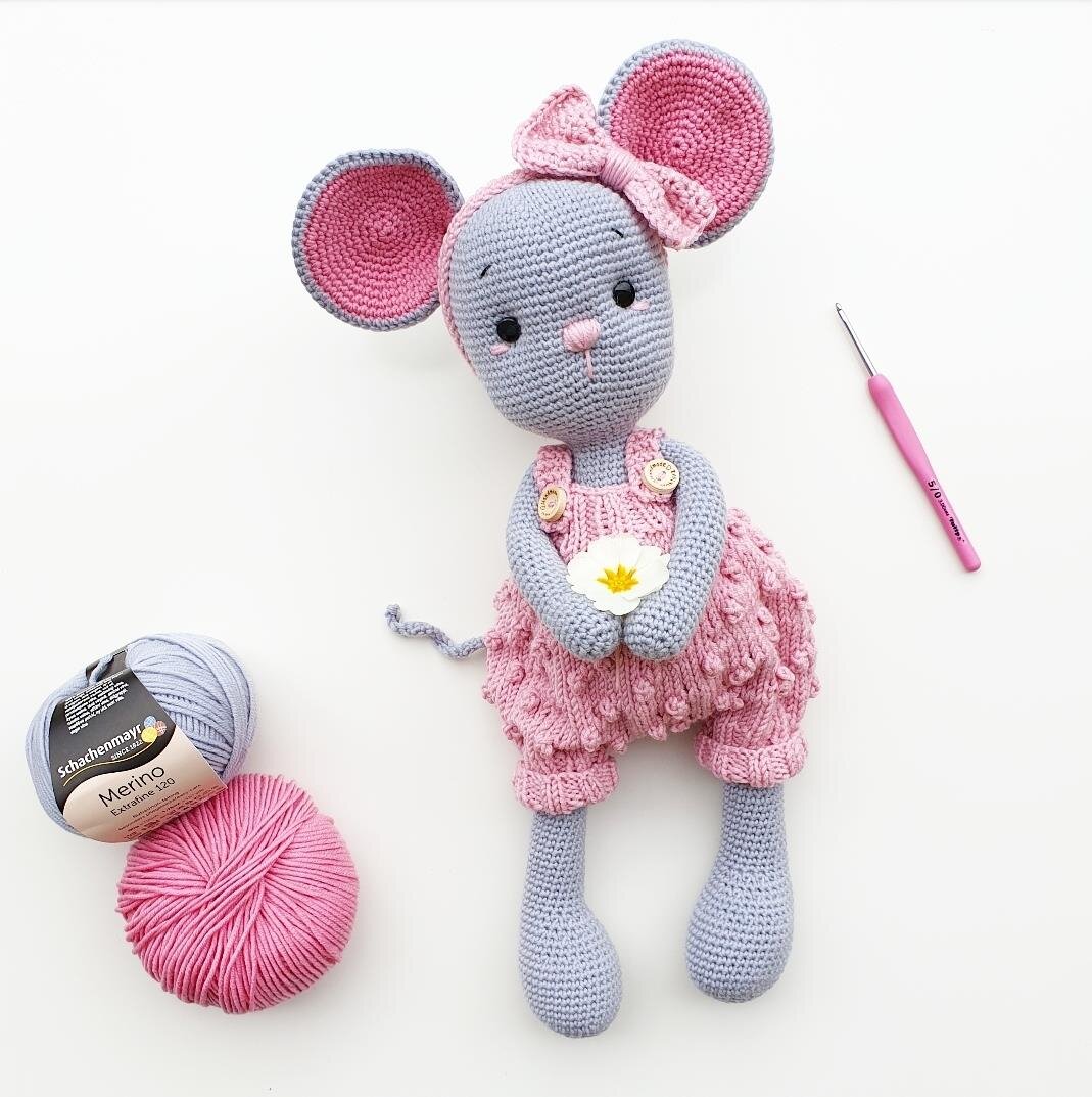 Отрежьте пряжу от розовых ушей и сплетите концы. Сложите серое и розовое ухо изнаночными сторонами вместе и свяжите их крючком, накидами по кругу, как показано на картинке.