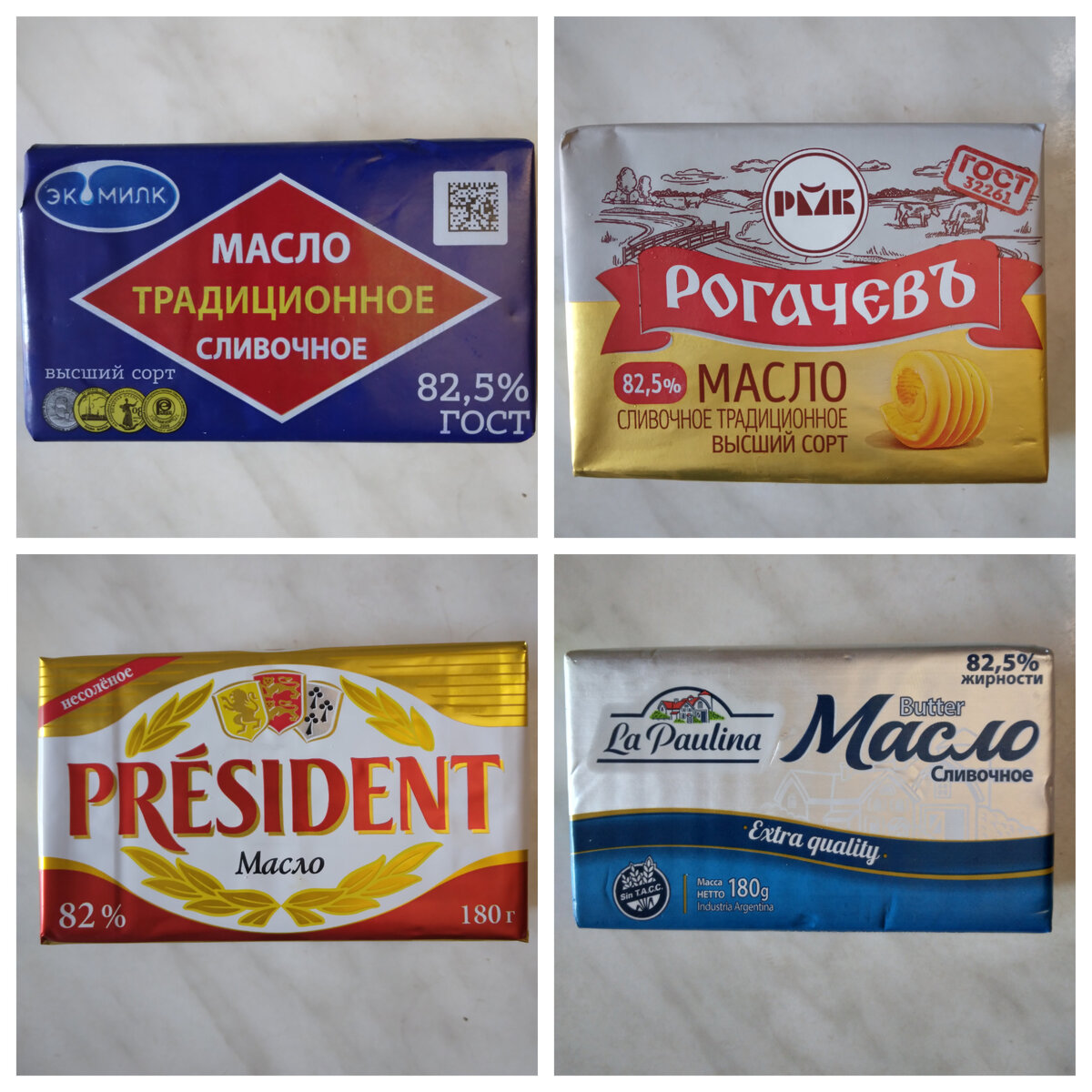 Выбрать сливочное масло особенно трудно, ведь продукция разных брендов в рамках одной категории не отличается по составу или жирности. Приходится выбирать по вкусу. Для сравнения я приобрела с ближайшем магазине 4 упаковки традиционного сливочного масла от 82% до 82,5% жирности по цене от 199 до 239 рублей. Какой из брендов окажется вкуснее? Сливочное масло «Рогачевъ» Мне очень нравится сгущенка марки «Рогачевъ», о чем я писала в соответствующем обзоре. Естественно, я ожидала, что сливочное масло этого бренда тоже меня порадует. К сожалению, я ошиблась. Цвет масла «Рогачевъ» бледно-жёлтый, равномерный. Аромат слабо-сливочный, едва ощутимый. Структура гомогенная, масло не слишком твёрдое. Мажется на хлеб легко, неравномерно. Яркими вкусовыми свойствами масло «Рогачевъ» не отличается. По сути оно просто жирное, только в послевкусии чувствуется очень легкая кислинка. Повторно вряд ли буду покупать это масло. Оно качественное, но не интересное. При этом, цена у него была выше, чем у других