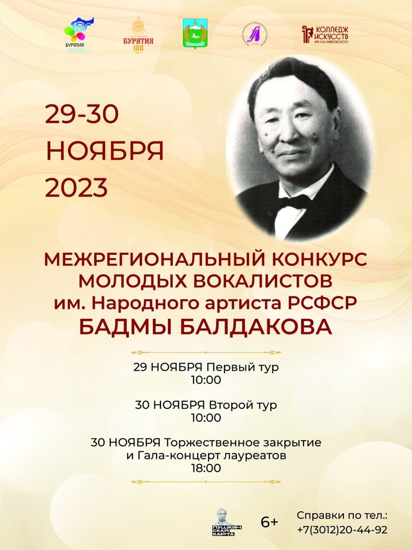 С 29 по 30 ноября 2023 года в г. Улан-Удэ состоится межрегиональный конкурс молодых вокалистов имени народного артиста РСФСР Бадмы Балдакова. К участию в конкурсе приглашаются исполнители: солисты, артисты хора, ансамблей, студенты ССУЗов и ВУЗов, исполнители народных песен, самодеятельные певцы-любители. Конкурсные испытания проводятся по двум номинациям: академическое пение и народное пение. Учредители межрегионального конкурса Министерство культуры Республики Бурятия; Негосударственная некоммерческая организация «Ассоциация музыкальных образовательных организаций»; Администрация МО «Курумканский район»; Колледж искусств им. П.И. Чайковского». Цели и задачи Конкурса: - выявление и поддержка новых талантов в области сольного пения; - сохранение и развитие традиций народного и академического пения; - укрепление творческих связей и повышение имиджевой привлекательности Бурятии; - сохранение традиций отечественной вокально-исполнительской школы; - стимулирование отечественных композиторо