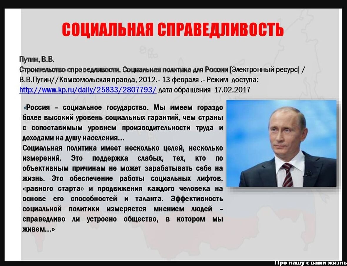 Совсем недавно попалось мне интервью с Кареном Шахназаровым. Где он много говорил о социальной справедливости. О том, что в нашем обществе невероятно большой запрос на неё. Ещё он говорил, что во время революции потому народ и пошёл за большевиками, что они имели идеологию, в которой социальная справедливость ставилась во главу угла. А вот теперь иметь идеологию нам даже по Конституции не положено. А как тогда обстоит дело с социальной справедливостью? Есть она вообще в России? И если есть, то как её себе представляет наш президент. Давайте вместе разберёмся в этом вопросе. Путин Как вы видите из его слов, социальная политика у нас в стране есть. И даже лучше, чем в других странах. Но это если верить его словам. Но я почему то не верю. Поэтому предлагаю начать разбираться по пунктам. Вот он говорит, что в первую очередь это поддержка слабых. А кто может быть более слабый, чем больные дети? Милосердие Болезни бывают разные, простите за банальность. В том числе и смертельные, причём скор