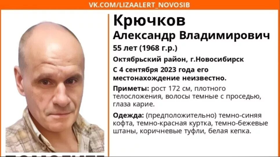В Октябрьском районе Новосибирска 4 сентября пропал 55-летний Александр Владимирович Крючков. Об этом сообщили в ВК-группе «Поисковый отряд ЛизаАлерт».