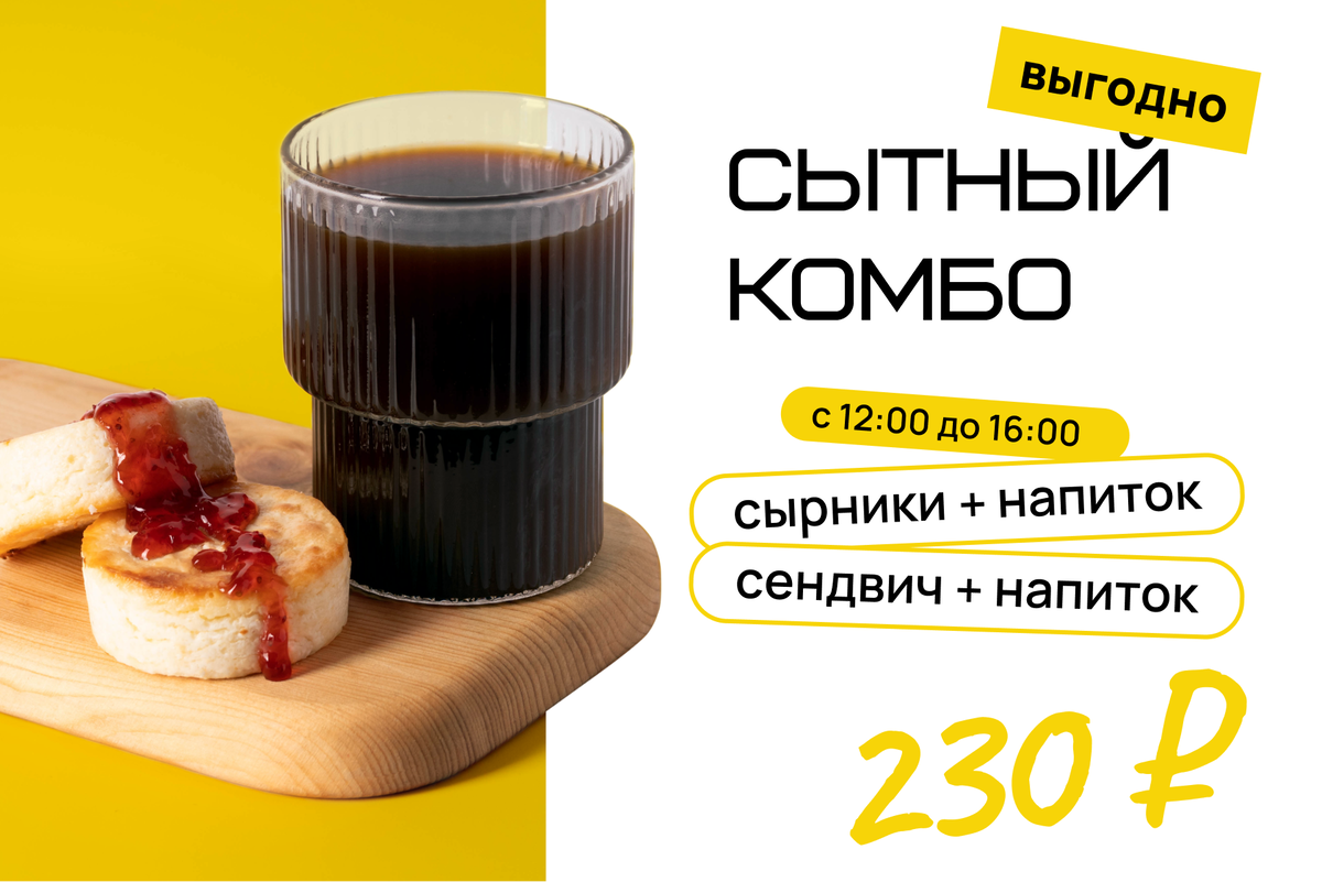 Комбо "Сытный перекус" – доступен каждый день с 12:00 до 16:00 в наших кофейнях. Выбери любой напиток и добавь к нему сэндвич или сырники со скидкой 20% в FASTCUP!