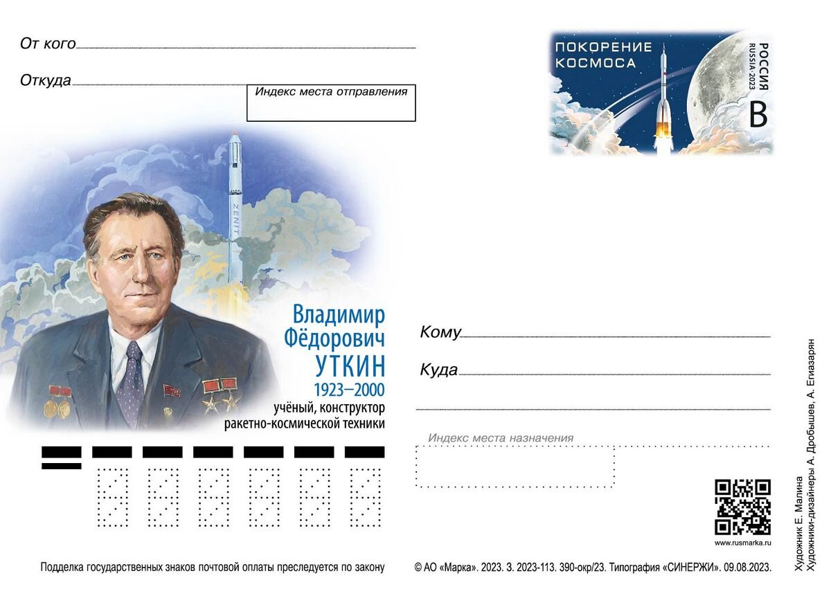 Почта России выпустила почтовую карточку с оригинальной маркой к 100-летию со дня рождения Владимира Федоровича Уткина, учёного, конструктора ракетно-космической техники. Об этом сообщили в пресс-службе компании. В честь советского учёного, одного из основоположников космонавтики, Владимира Уткина Почта России выпустила маркированную почтовую карточку тиражом 10 000 экземпляров и художественный штемпель с фиксированной датой. На оригинальной марке символически изображён запуск ракеты-носителя в космос, на почтовой карточке и штемпеле — портрет учёного. Владимир Уткин — академик, президент Российской академии космонавтики им. К. Э. Циолковского, Генеральный конструктор КБ «Южное» (1971–1990 гг.). Под его руководством создано четыре поколения стратегических ракетных комплексов, разработана современная Российская программа ракетно-космической техники. Имя учёного носит Рязанский государственный радиотехнический университет.