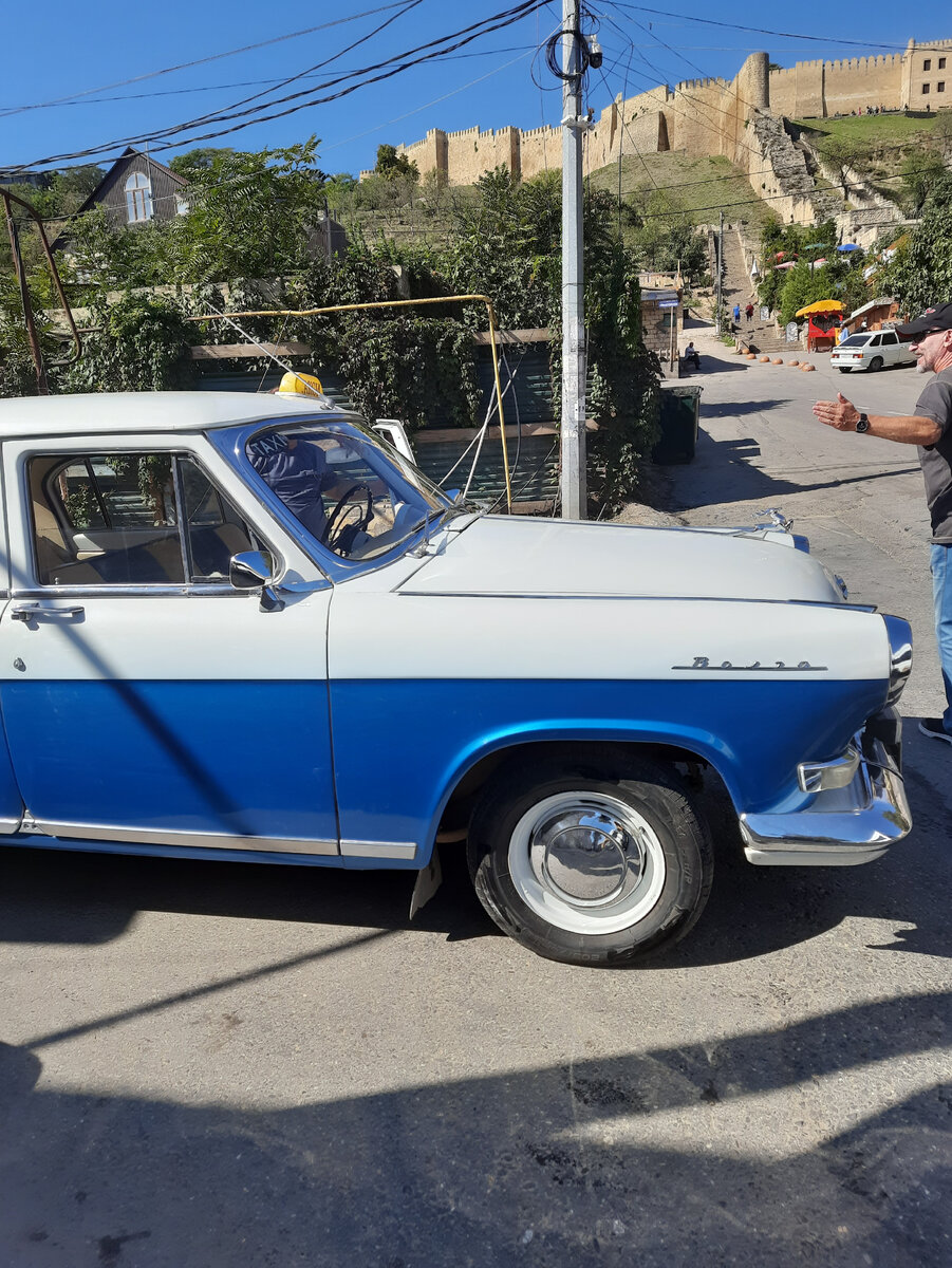 На второй наш день в Дербенте, прямо с утра, мы отправились посмотреть главную достопримечательность - крепость-цитадель Нарын-кала. От нашего дома мы решили доехать туда на автобусе №11, хотя можно было бы дойти пешком. Идти всего 2,5 км, но в горку. А мы предполагали, что по крепости надо будет долго гулять, поэтому решили приберечь свои силы. Вышли из автобуса недалеко от подъема на крепость. Сразу увидели вот такой раритет:). С нами в маршрутке ехала группа детишек с двумя воспитателями, они тоже направлялись в крепость. Мне понравилось, что при входе в маршрутку, воспитатель напомнила детям как надо вести себя в общественном транспорте. И дети не шумели, только стреляли по сторонам своими черными глазенками и улыбались мне)). После выхода из маршрутки воспитатели распределили детей в пары "мальчик-девочка" и наказали мальчикам присматривать за девочками. Мы все вместе начали подъем по ступеням. По сторонам лестницы располагаются различные аутентичные кафешки и сувенирные лавки. О