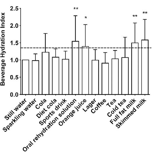 Рандомизированное исследование по оценке способности различных напитков влиять на состояние гидратации: разработка индекса гидратации напитка Было набрано 24 здоровых, физически активных мужчины в возрасте от 18 до 35 лет. Напитки: газированная вода, Coca-Cola, Diet Coke, Powerade, раствор для пероральной регидратации (РПР), апельсиновый сок, светлое пиво, горячий черный кофе, горячий черный чай, холодный черный чай, цельное молоко (3,6% жирности) или обезжиренное молоко (0,1% жирности). Через 2 часа жирное молоко, обезжиренное молоко, РПР и апельсиновый сок имели более высокий индекс гидратации BHI, чем негазированная вода. Рассчитанный индекс гидратации показал, что напитки с самым высоким содержанием макронутриентов и электролитов были наиболее эффективными для поддержания баланса жидкости. В настоящем исследовании РПР и молочные напитки содержали относительно высокие концентрации натрия и калия, апельсиновый сок содержал умеренное количество калия, а остальные напитки содержали от