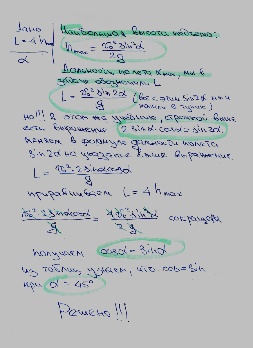 Задача: Под каким углом к горизонту брошено тело, если дальность полёта в четыре раза больше максимальной высоты подъёма? Сопротивлением воздуха пренебречь. Решение: И так, у нас известно что длинна полёта L=4h где h, максимальная высота подъёма. Далее, берём из учебника формулу максимальной высоты подъёма и формулу дальность полёта. Приравниваем их 1/4 и решаем. Решение в принципе элементарное, но мы сегодня в группе не смогли довести решение до конца, упёрлись в забор из тригонометрии. Сейчас дома спокойно разобрался с синусами и косинусами, теперь могу опубликовать. Пишем: