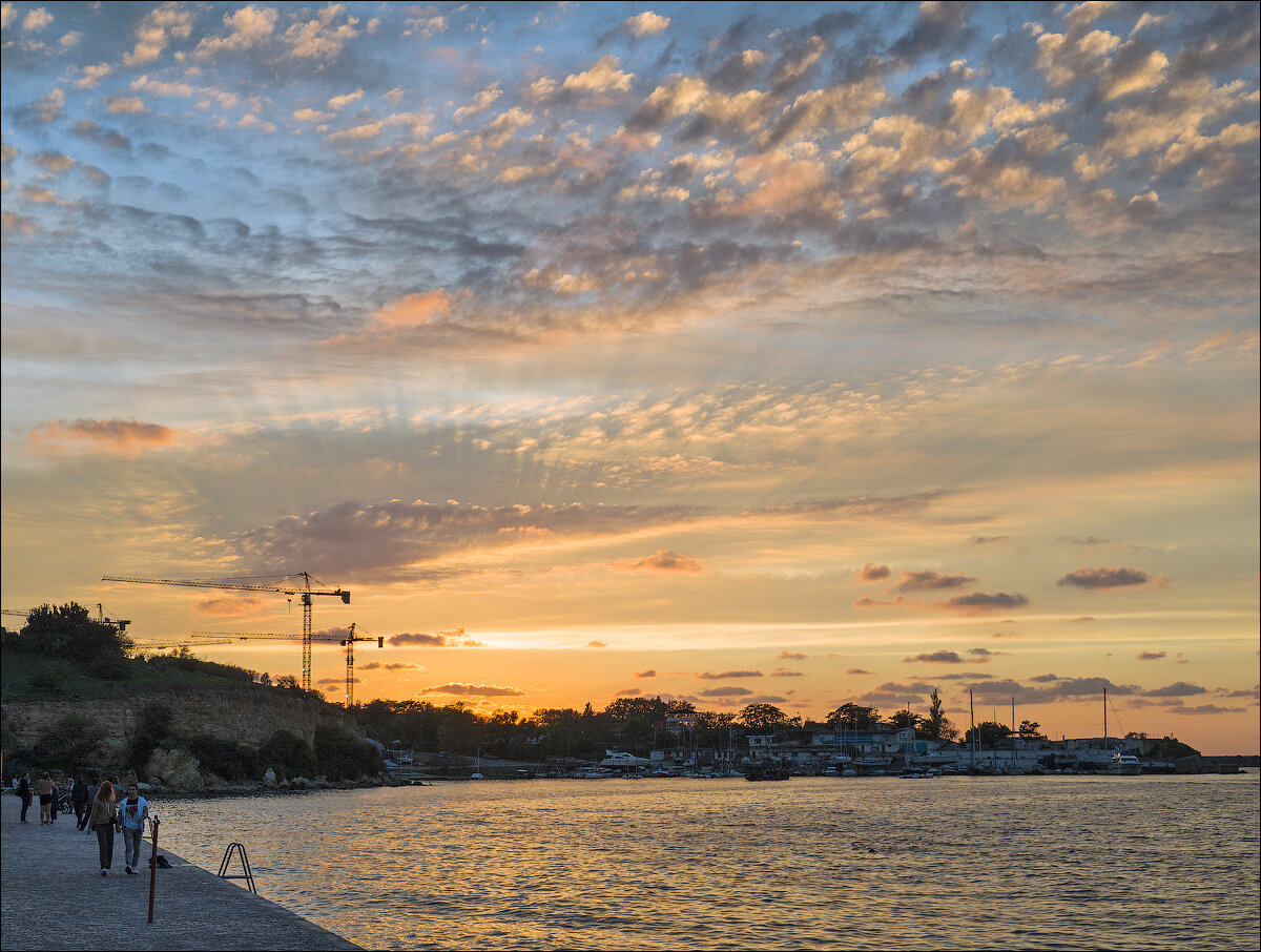 И солнце картинно выпрастывало снопы лучей сквозь тучи по этим невозможным небесам. А над городом небо понемногу начинало темнеть, гаснуть — и становилось откровенно зелёным! И по этому зелёному небу плыли фиолетово-розово-сиреневые облака! Цветовое сочетание абсолютно ненормальное, выносящее мозг — и безумно красивое! Потом небо над городом всё темнело, становилось синее и синее, и тоже было потрясающе прекрасным. И облака меняли цвет, и всё вокруг просто сияло, а народ стоял на берегу и маниакально фотографировал, фотографировал… А Лена всё никак не могла вылезти из воды. Она смотрела направо, налево, вверх — восторгаясь. Какой подарок нам преподнёс Севастополь на прощание!