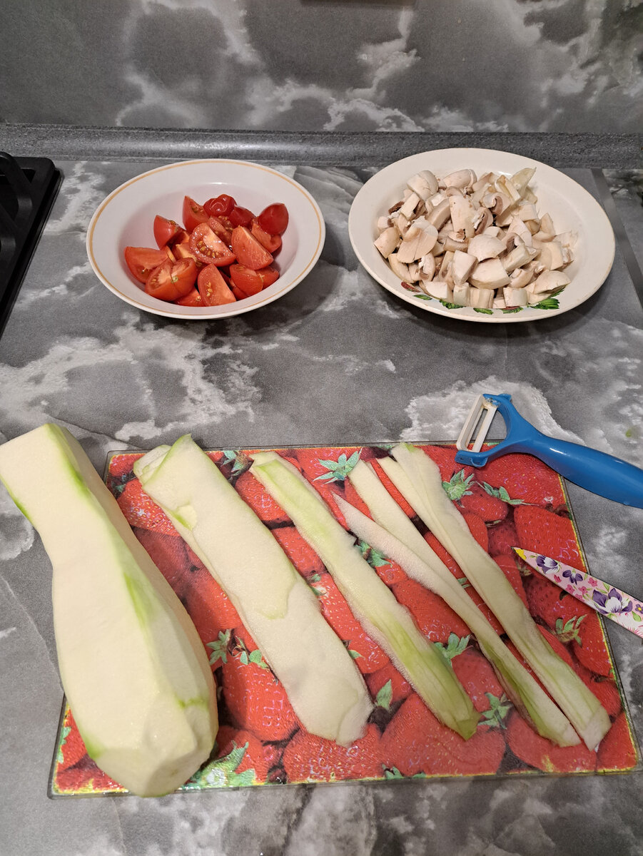 Ингредиенты: Способ приготовления: 1. Помидоры и шампиньоны порезать как на фото. Кабачки отчисть и с помощью овощечистки нарезать их на плоские тонкие дольки. После чего ещё раз ножом порезать на более тонкие кусочки. См. фото. 2. Обжарить грибы 2-3 минуты. 3. Добавить помидоры и твороженный сыр. Жарить до полного расплавления сыра. 4. Добавить кабачки, поставить минимальный огонь, накрыть крышкой и оставить до мягкости кабачков на 5-10 минут. Приятного аппетита)