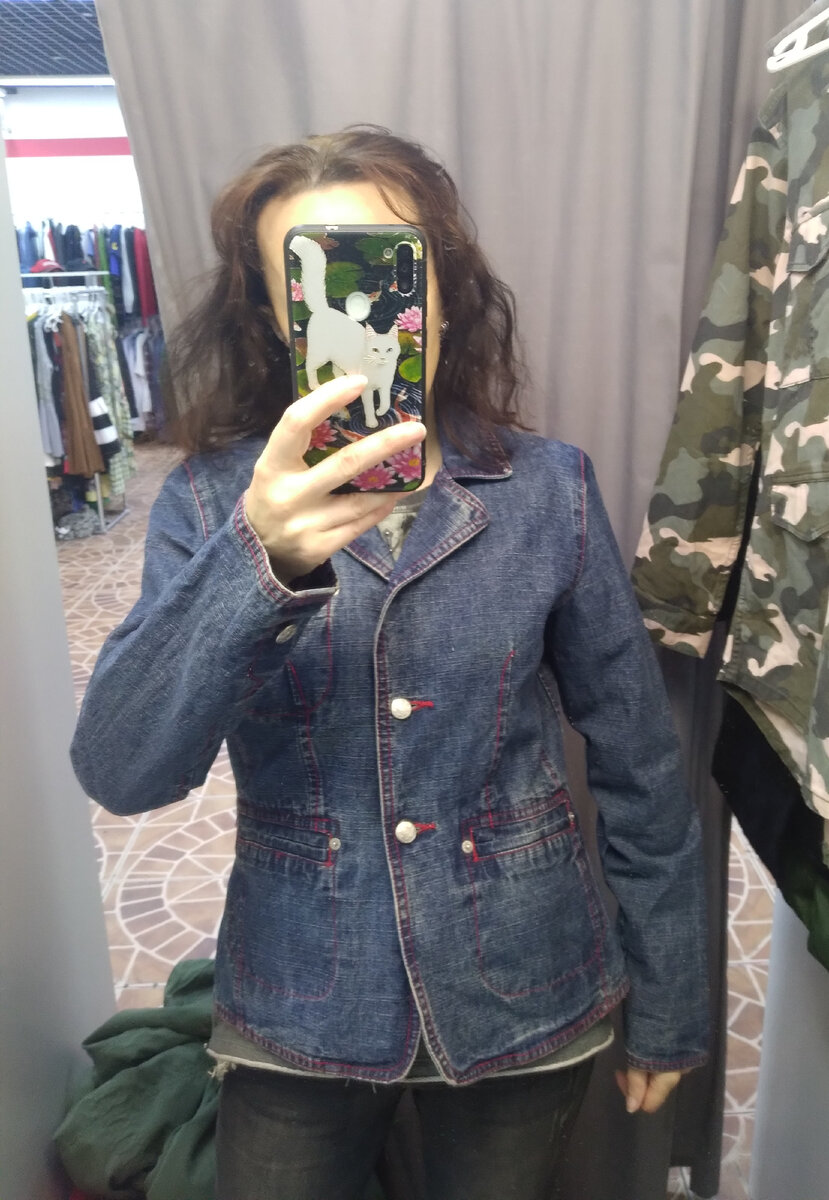 Джинсовый чуть приталенный жакет с металлическими пуговицами и заклепками.