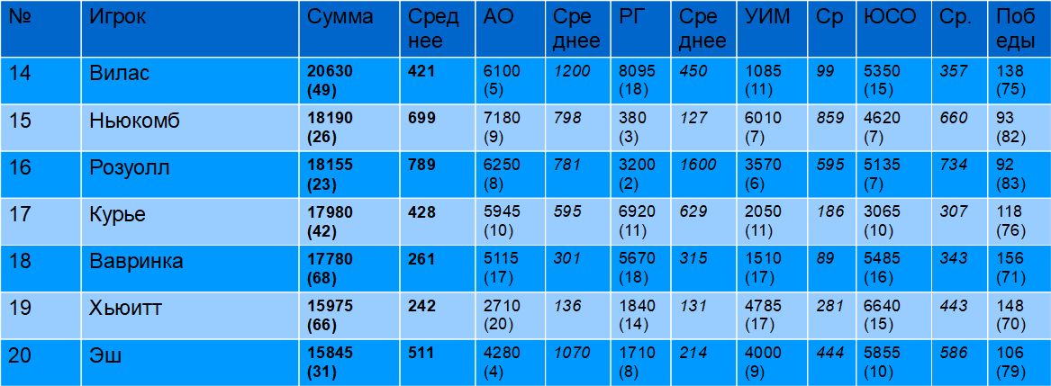 Пересчитал для игроков очки на турнирах по современной системе начисления: титул - 2000, финал - 1200, полуфинал - 720, четвертьфинал - 360, 4 круг - 180, 3 круг - 90, 2 круг - 45, 1 круг - 10.