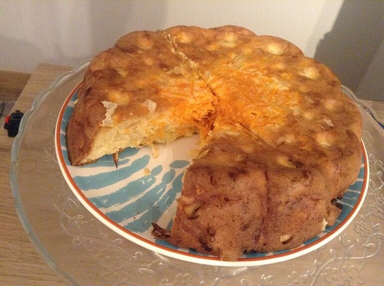 Надо: - Кефир - 1 ст. - Мука - см. по замесу - Яйца - 2 шт. - Соль, сахар - по щепотке - Разрыхлитель - 1/2 ч.л. - Капуста - 1/4 среднего качана - Морковь - 1 шт. - Масло подсолнечное Процесс: Разогреваем духовку до 180 градусов. Капусту шинкуем, морковь трем на средней терке. Перемешиваем. Замешиваем (можно венчиком) тесто. Муку вводим последней и следим за консистенцией - оно должно быть как магазинная сметана 15 % жирности. Форму для выпечки смазываем маслом. Можно застелить её пекарской бумагой. А можно использовать силиконовую основу и просто предварительно смочить холодной водой. Вниз закладываем овощи. Сверху заливаем тестом. Ставим в духовку на 40-60 минут. Если верхушка начинает подгорать, то накройте ее фольгой.