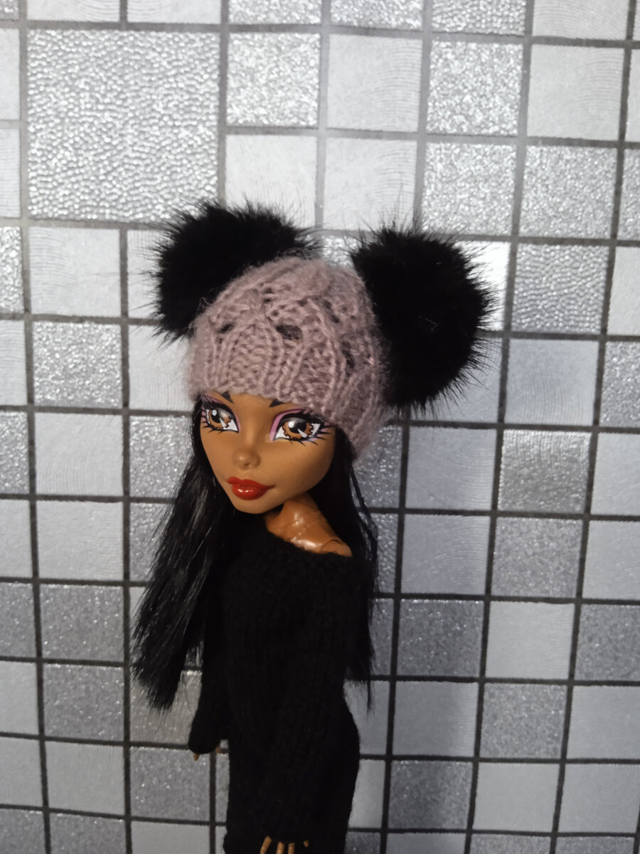 Шапка для Монстер Хай своими руками. Пряжа - Alize Angora Gold ( 550 м/100гр) Спицы - №1,5 Узор для шапули нашла на просторах интернета у Ирины Снежной. Набираем на спицы 42 петли 1 ряд: кром., 1 изн., (2 лиц., 2 изн.)*, 2лиц., 1 изн., кром. (кромочные есть и в следующих рядах, я их не буду каждый раз указывать) 2 ряд: по рисунку - изнаночные петли изнаночными, лицевые - лицевыми провязываем 3 - 6 ряд: - вяжем по рисунку (резинкой) 7 ряд: (2 вместе лицевой с наклоном вправо, 2 накида, в вместе лицевой с наклоном влево)* 8 ряд: изнаночные петли, второй накид провязываем изнаночной скрещенной 9 ряд: 1 лиц., (2 изн., следующие две петли перекрестить следующим образом - 1-ю снять перед работой, провязываем 2-ю лицевой, потом 1-ю лицевой)*, 2 изн, 1 лиц. 10 ряд: по рисунку 11 ряд: накид, 2 вместе с наклоном влево, (2 вместе лицевой с наклоном вправо, 2 накида, в вместе лицевой с наклоном влево)*, 2 вместе с наклоном вправо, накид 12 ряд: изнаночные петли, второй накид провязываем изнаночной