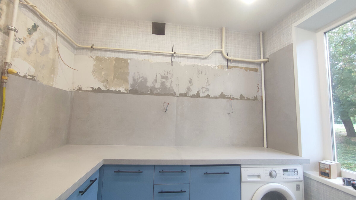 Вместе с керамогранитом вышел и слой гипсокартона под ним. Осталось пропилить лобзиком слой фанеры. Это только кажется проще, но на самом деле там под фанерой шкафы. Один, который под плитой, будет без проблем. Панель как раз по размеру шкафа, и дырка для нее аккурат по ширине шкафа получается. А вот под мойку дырочка нам сложнее далась. Мойку чуть сдвигаем вправо, залезая днищем на соседний шкаф, так что, пришлось не только в верхней фанере вырезать, но еще и в боковой стенке. Слава богу что все днище мойки поместилось только в объем шкафа под ней, соседний угловой шкаф удачно не попал под раздачу. Но, все равно, пришлось укреплять конструкцию шкафа под мойкой дабы не развалился после выпиливания его боковой стенки. Короче, провозились весь день, хотя я наивно предполагала, что за пару часов справимся😁😁😁. Не, нуачо? Подумаешь две дырки вырезать и просто сверху вставить вставляемое :)))) Ага, щаззз! Там столько возни было, что хватило на весь день :)) Но мы справились и с этой задачей!
