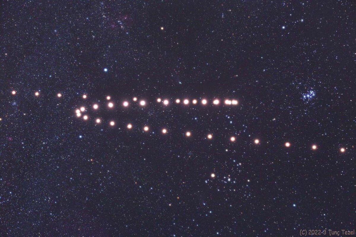 Нажмите, что бы скачать решение и ответы № 3 Это изображение смонтировано из фотографий, полученных с интервалом в неделю. На нём запечатлено движение одной из планет на фоне далёких звёзд. Открыть изображение в новой вкладке Сколько месяцев длилась съёмка? Ответ округлите до целых. Число Что это за планета? Меркурий Венера Марс Уран Нетрудно заметить, что блеск планеты сильно изменяется во время съёмки. Максимум приходится на центр «зигзага». Выберите верное объяснение этого наблюдения: Планета и Земля обращаются вокруг Солнца, поэтому расстояние между планетой и Землёй периодически изменяется. Чем ближе планета к Земле, тем ярче она выглядит Планета проходит через облака межпланетной пыли, которая частично поглощает свет и вызывает видимое потускнение небесного тела Радиус планеты периодически изменяется из‑за внутренних процессов. Чем больше планета, тем ярче она выглядит Нажмите, что бы скачать решение и ответы