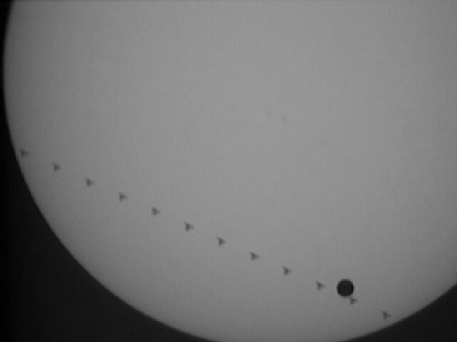 Нажмите, что бы скачать решение и ответы № 3 Эта картинка — коллаж серии изображений «двойного прохождения», полученных 8 июня 2004 года. На снимках запечатлены Международная космическая станция (МКС) и планета на фоне диска Солнца. Что это за планета? Сатурн Венера Марс Юпитер «Двойное прохождение» наблюдалось в узкой полосе на Земле в течение весьма непродолжительного времени. Смонтированные кадры снимались с промежутками всего в 0.033 секунды. Определите общую продолжительность съёмки серии. Ответ выразите в секундах, округлите до десятых. Число Почему видимые угловые размеры МКС и планеты оказались сопоставимы? МКС гораздо меньше планеты, но при этом гораздо ближе к наблюдателю МКС — величайшее сооружение человечества, имеющее в действительности размеры Меркурия Это оптическое явление, аналогичное искажению форм объектов в потоке воздуха над костром МКС движется столь быстро, что её видимые размеры увеличиваются Нажмите, что бы скачать решение и ответы