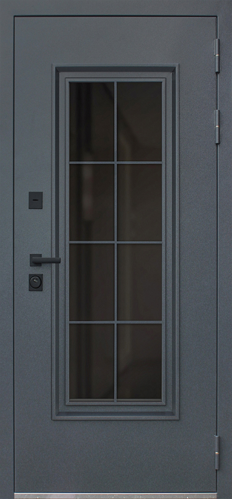 Петли: 3 петли с подшипником. Внешняя отделка: Лист металла 1,8 мм. Два слоя покрытия. Металлофиленки. Английская решетка внутри тонированного стеклопакета (цвет "Букле графит"). Наличники гладкие.