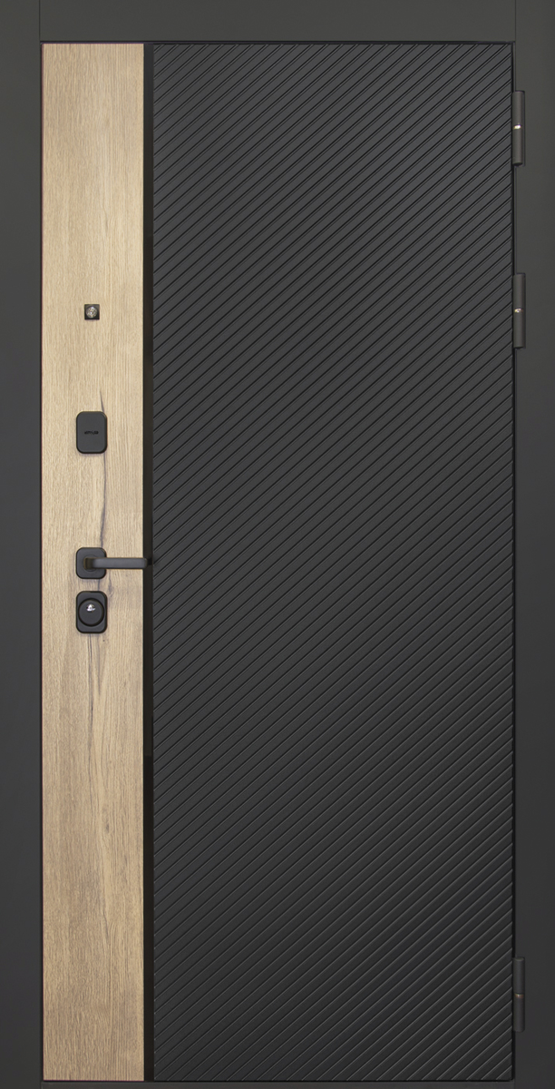 Покрытие: Порошковое покрытие "муар черный". Петли: 3 петли с подшипником. Внешняя отделка: Наружный лист металла 1,5 мм. Панель МДФ 10 мм. Объемная фрезеровка. Дизайн панели выполнен в виде цветовой комбинации: "дуб галиф натур", "шагрень черная", декоративная пластиковая вставка в черном цвете. Наличник МДФ 80 мм, цвет "черный кварц"