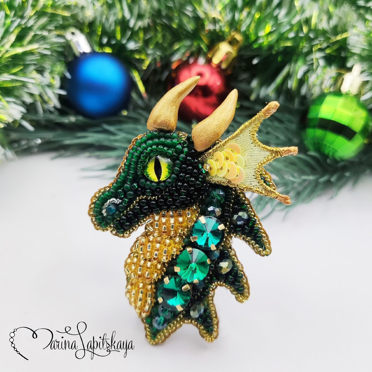 Весёлый, добрый, славненький!.. Л. Кузнецова До Нового года еще далеко, но к встрече лучше готовиться заранее, тем более «хозяином» года будет Зеленый Дракон, единственное мифическое животное во всем зодиакальном круге. Дракон символизирует силу и великодушие, мужество и выносливость. Он несет дух возрождения и изменений, представляя собой продуктивные силы природы. В 2024 году придет время традиционно зеленого зверя. Зеленый цвет символизирует возрождение, начало новой жизни, всяческие перемены и сюрпризы. Для изготовления броши понадобятся: ▪️ фетр жесткий толщиной 1 мм, ▪️ акриловые краски, ▪️ бисер японский или чешский № 10 (зеленых оттенков и золотистый "огонёк"), ▪️ бисер №15 (зелёный), ▪️ микс японский изумрудно-зелёный (не обязательно), ▪️ канитель жесткая золотистая, ▪️ трунцал золотистый (для ноздри), ▪️ глаз 8 мм - 1 шт, ▪️ шатоны 8 мм - 3 шт. зелёного цвета, ▪️ рондели 4 мм (зеленых оттенков)