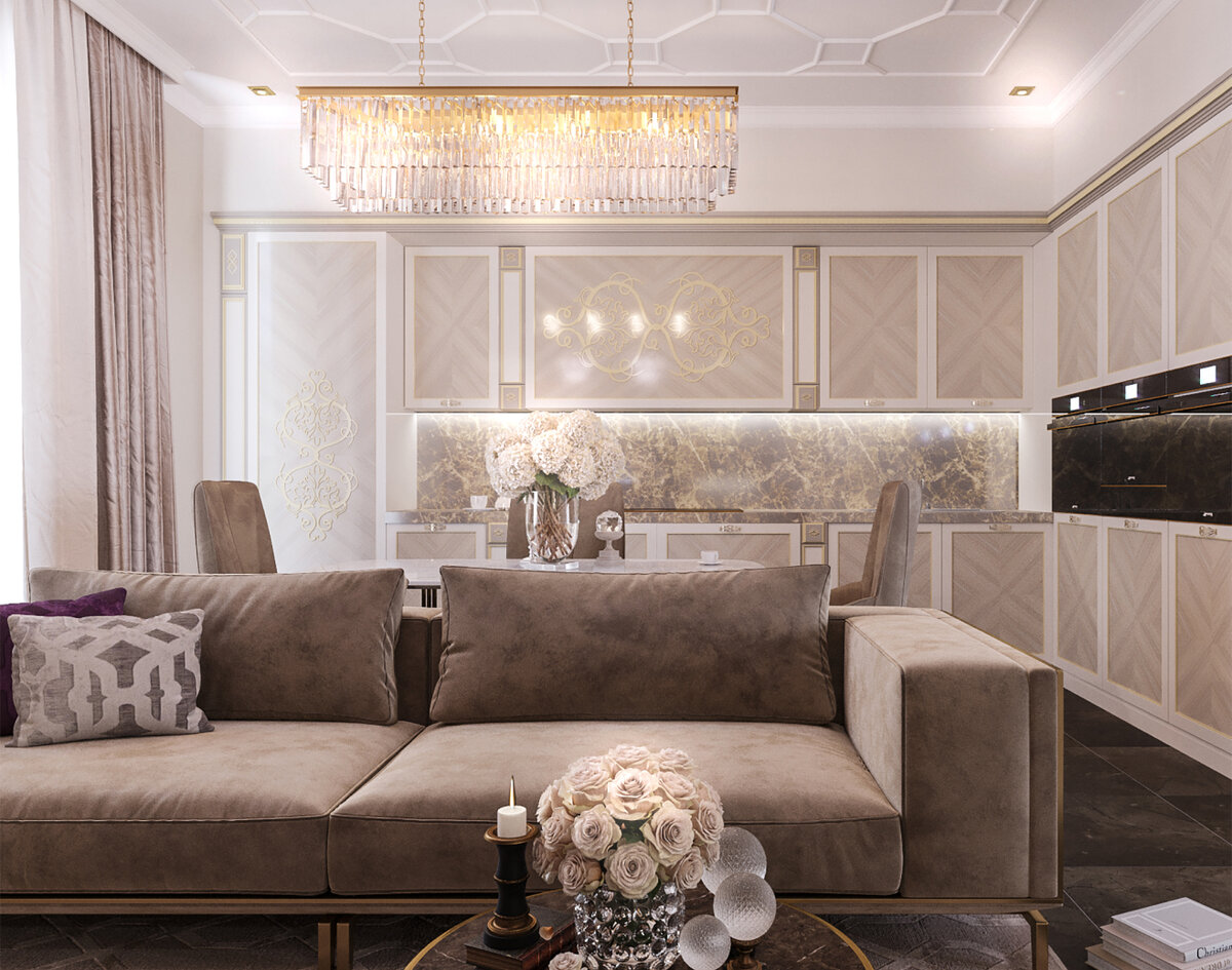 Площадь 210м² Urquiola - это неоклассический интерьер с элементами стиля фьюжн, который разрабатывался на основе предпочтений каждого члена семьи. КУХНЯ Основными цветами для кухни были выбраны белый, светло-коричневый и золотой для акцентов. По центру помещения расположены обеденный стол и мягкий диван, которые образуют границу рабочей зоны и места отдыха. Чтобы использовать максимум пространства, кухонный гарнитур и решили встроить стену, а напротив та же работа была проделана с шкафом, в котором предусмотрена задекорированная чёрным мрамором ниша под телевизор. Роскоши придаёт продуманная система освещения с навесными люстрами, дополнительными лампами и светодиодной подсветкой фартука. СПАЛЬНЯ 1 Первая спальня реализована по схожей концепции с кухней. Продуманная система освещения с массивной навесной люстрой и орнаментом на потолке подчёркивает достоинства неоклассического стиля. А декоративные элементы в виде узора, напоминающего листовые пластинки, по обе стороны спального