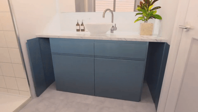 Если у вас дома ванная комната настолько маленькая, что вы не можете полностью открыть дверь, или если вы думаете, что это могла бы быть полноценная ванная комната, если бы она была немного шире, этот креативный дизайн для вас.