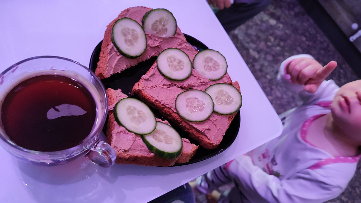 Хлебушек с паштетом, ломтики огурца. И горячая кружечка крепкого чая с лимоном. Как хорошо, что дочери я предусмотрительно отложила без масла, теперь могу на него претендовать, сразу калорийность меньше.