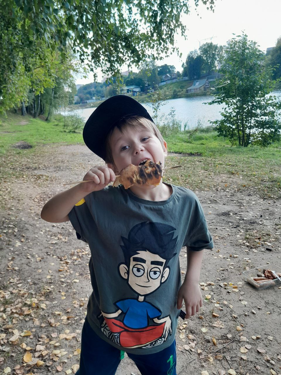 Какое счастье, что женщины с нами нет. Мы как истинные мужики. Творим что хотим и пачкаемся. Берем ножик и строгаем палку, если забыли шампуры. Сын безумно счастлив. А я рад, что у меня не растет рафинированный пацан, который боится испачкать руки.