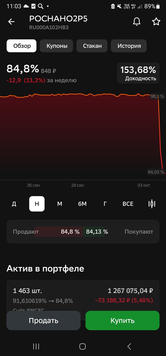 Добрый день, уважаемые читатели. Внимание, все, что дальше написано не является индивидуальной инвестиционной рекомендацией. Возможная 100% потеря капитала, вложенного в облигации Роснано. Не повторяйте и не участвуйте, если сами не решили. Продолжается история с Роснано. Всё, как ожидалось, через пару месяцев у Роснано закрытие очередного выпуска облигаций. Вчера прошла волна новостей, что у Роснано дыра в бюджете в размере почти 100 млрд и у них нет внутри денег, чтобы закрыть облигации. Т. Е. Роснано, теоретически, может стать банкротом. В этом случае выплаты по облигациям будут точно не в первую очередь... И, возможно, выплат совсем не будет. Это вполне рабочий вариант. Но, такая история уже была у них один раз в 2021. Тоже компания заявляла о вероятности невыполнения обязательств по облигациям. Собственно по этому их облигации постоянно висели с дисконтом к рынку. После вчерашних новостей сейчас Роснано можно купить доходностью 150%+ годовых: Напоминаю, что Роснано - 10